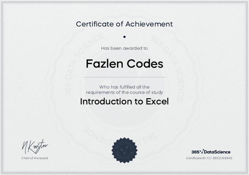 This user has been awarded the Introduction to Excel Certificate for successfully completing the course exam. Holding this certificate demonstrates their proficiency on the topic and signifies they are qualified to apply their newly acquired expertise in the fields of data analytics and data science.