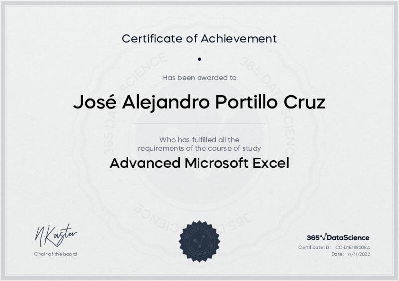 This user has been awarded the Advanced Microsoft Excel Certificate for successfully completing the course exam. Holding this certificate demonstrates their proficiency on the topic and signifies they are qualified to apply their newly acquired expertise in the fields of data analytics and data science.