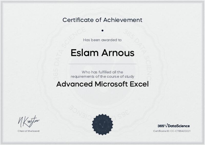 This user has been awarded the Advanced Microsoft Excel Certificate for successfully completing the course exam. Holding this certificate demonstrates their proficiency on the topic and signifies they are qualified to apply their newly acquired expertise in the fields of data analytics and data science.