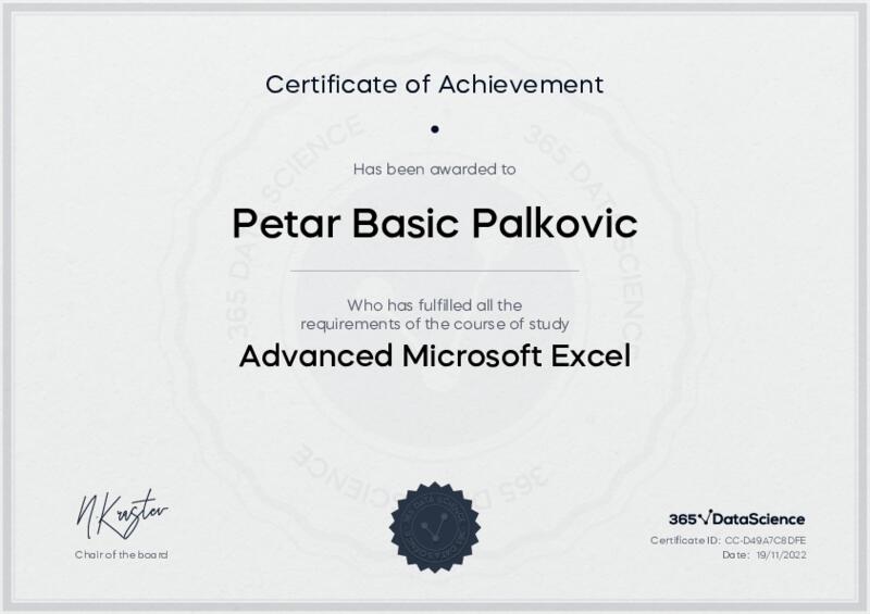 This user has been awarded the Advanced Microsoft Excel Certificate for successfully completing the course exam. Holding this certificate demonstrates their proficiency on the topic and signifies they are qualified to apply their newly acquired expertise in the fields of data analytics and data science.