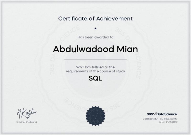 This user has been awarded the SQL Certificate for successfully completing the course exam. Holding this certificate demonstrates their proficiency on the topic and signifies they are qualified to apply their newly acquired expertise in the fields of data analytics and data science.