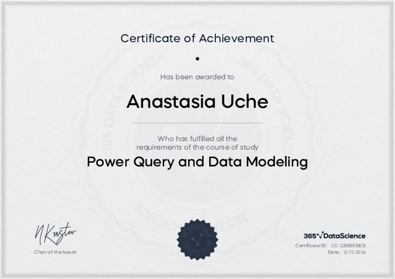 This user has been awarded the Power Query and Data Modeling Certificate for successfully completing the course exam. Holding this certificate demonstrates their proficiency on the topic and signifies they are qualified to apply their newly acquired expertise in the fields of data analytics and data science.