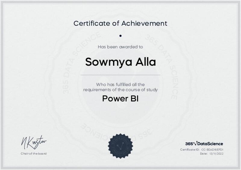 This user has been awarded the Power BI Certificate for successfully completing the course exam. Holding this certificate demonstrates their proficiency on the topic and signifies they are qualified to apply their newly acquired expertise in the fields of data analytics and data science.