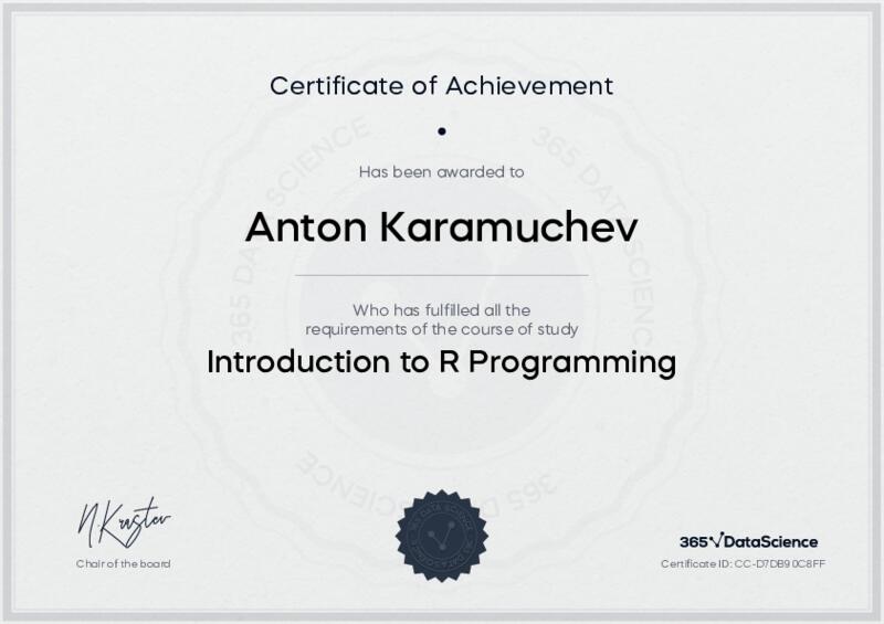 This user has been awarded the Introduction to R Programming Certificate for successfully completing the course exam. Holding this certificate demonstrates their proficiency on the topic and signifies they are qualified to apply their newly acquired expertise in the fields of data analytics and data science.