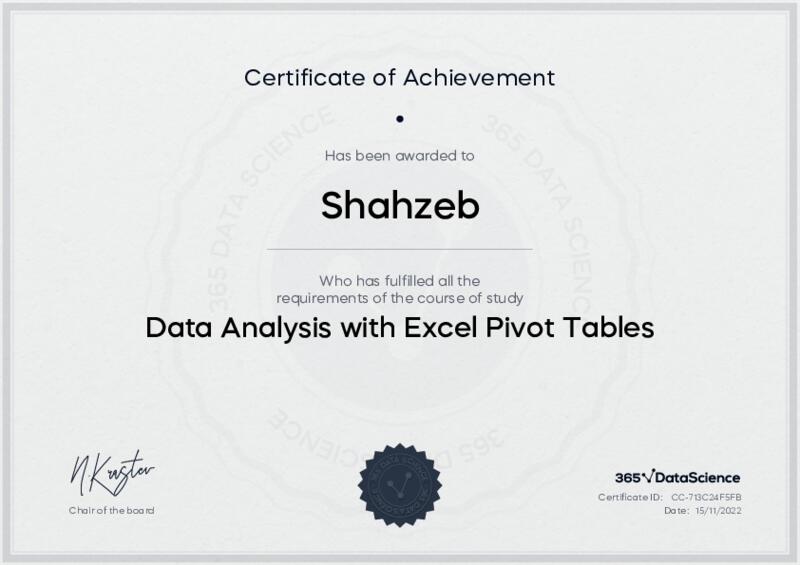 This user has been awarded the Data Analysis with Excel Pivot Tables Certificate for successfully completing the course exam. Holding this certificate demonstrates their proficiency on the topic and signifies they are qualified to apply their newly acquired expertise in the fields of data analytics and data science.