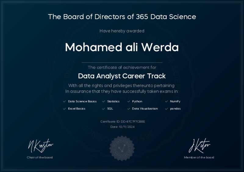 This user has been awarded the Data Analyst Career Track Certificate for successfully completing all courses and assessments. This certificate confirms their technical expertise and professional credibility to work as a data analyst.