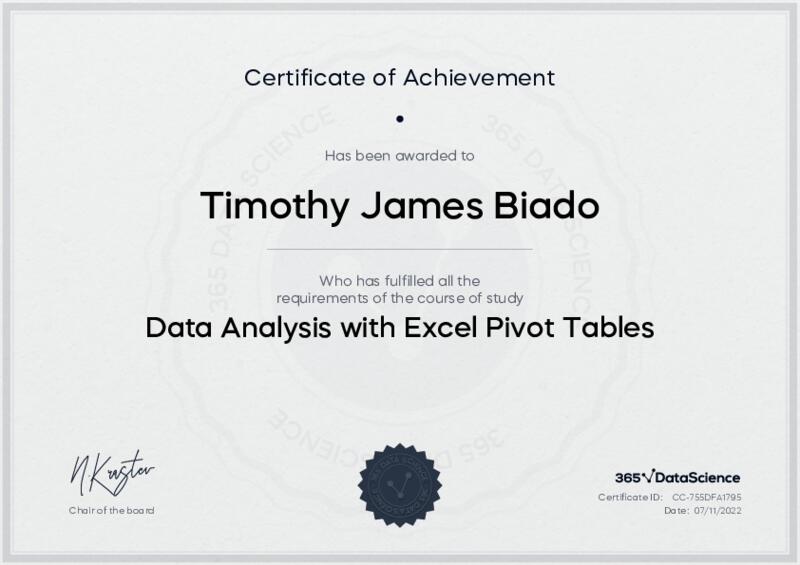 This user has been awarded the Data Analysis with Excel Pivot Tables Certificate for successfully completing the course exam. Holding this certificate demonstrates their proficiency on the topic and signifies they are qualified to apply their newly acquired expertise in the fields of data analytics and data science.