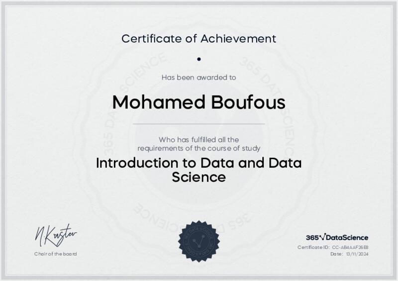 This user has been awarded the Introduction to Data and Data Science Certificate for successfully completing the course exam. Holding this certificate demonstrates their proficiency on the topic and signifies they are qualified to apply their newly acquired expertise in the fields of data analytics and data science.