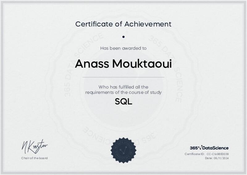 This user has been awarded the SQL Certificate for successfully completing the course exam. Holding this certificate demonstrates their proficiency on the topic and signifies they are qualified to apply their newly acquired expertise in the fields of data analytics and data science.