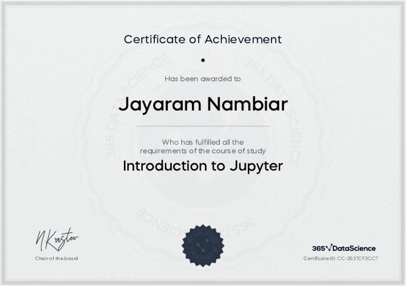 This user has been awarded the Introduction to Jupyter Certificate for successfully completing the course exam. Holding this certificate demonstrates their proficiency on the topic and signifies they are qualified to apply their newly acquired expertise in the fields of data analytics and data science.