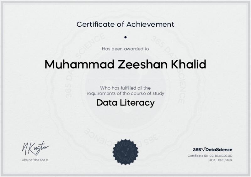 This user has been awarded the Data Literacy Certificate for successfully completing the course exam. Holding this certificate demonstrates their proficiency on the topic and signifies they are qualified to apply their newly acquired expertise in the fields of data analytics and data science.