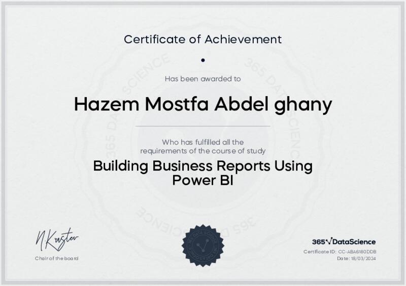 This user has been awarded the Building Business Reports Using Power BI Certificate for successfully completing the course exam. Holding this certificate demonstrates their proficiency on the topic and signifies they are qualified to apply their newly acquired expertise in the fields of data analytics and data science.