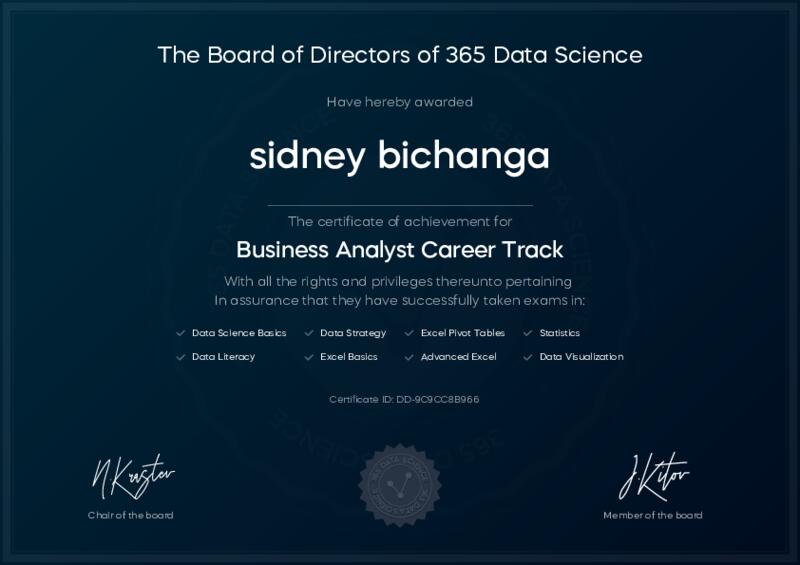 This user has been awarded the Business Analyst Career Track Certificate for successfully completing all courses and assessments. This certificate confirms their technical expertise and professional credibility to work as a business analyst.