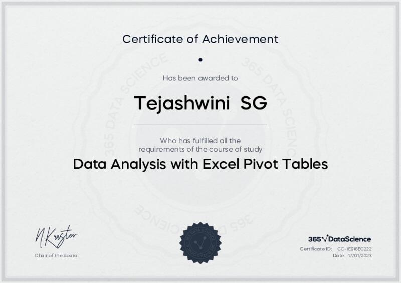 This user has been awarded the Data Analysis with Excel Pivot Tables Certificate for successfully completing the course exam. Holding this certificate demonstrates their proficiency on the topic and signifies they are qualified to apply their newly acquired expertise in the fields of data analytics and data science.