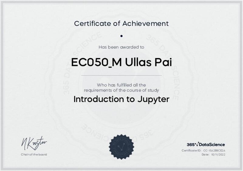 This user has been awarded the Introduction to Jupyter Certificate for successfully completing the course exam. Holding this certificate demonstrates their proficiency on the topic and signifies they are qualified to apply their newly acquired expertise in the fields of data analytics and data science.