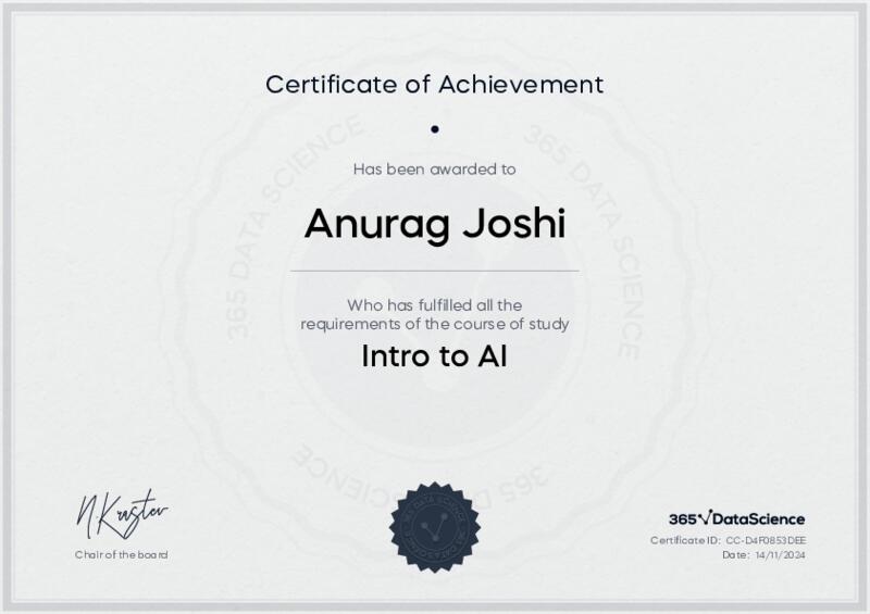 This user has been awarded the Intro to AI Certificate for successfully completing the course exam. Holding this certificate demonstrates their proficiency on the topic and signifies they are qualified to apply their newly acquired expertise in the fields of data analytics and data science.