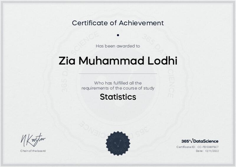 This user has been awarded the Statistics Certificate for successfully completing the course exam. Holding this certificate demonstrates their proficiency on the topic and signifies they are qualified to apply their newly acquired expertise in the fields of data analytics and data science.