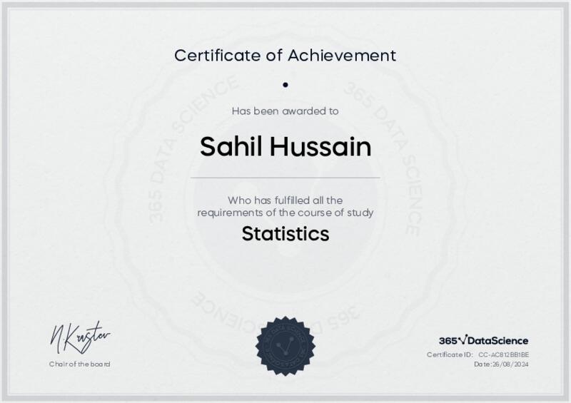This user has been awarded the Statistics Certificate for successfully completing the course exam. Holding this certificate demonstrates their proficiency on the topic and signifies they are qualified to apply their newly acquired expertise in the fields of data analytics and data science.