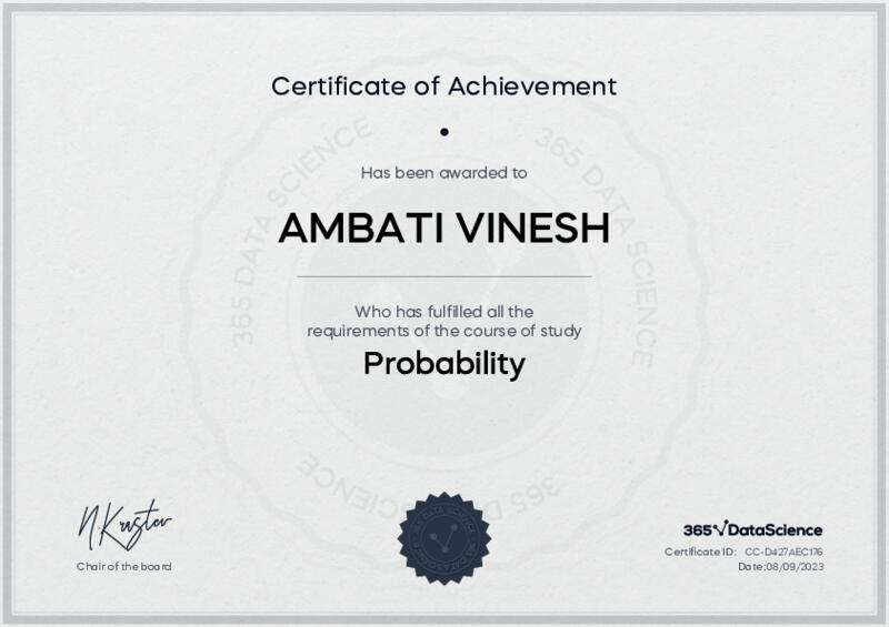 This user has been awarded the Probability Certificate for successfully completing the course exam. Holding this certificate demonstrates their proficiency on the topic and signifies they are qualified to apply their newly acquired expertise in the fields of data analytics and data science.