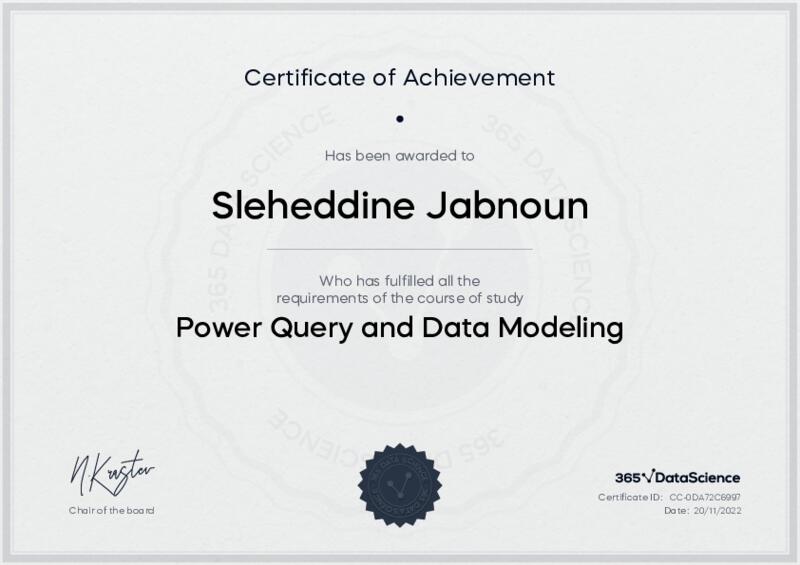 This user has been awarded the Power Query and Data Modeling Certificate for successfully completing the course exam. Holding this certificate demonstrates their proficiency on the topic and signifies they are qualified to apply their newly acquired expertise in the fields of data analytics and data science.