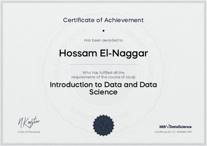 This user has been awarded the Introduction to Data and Data Science Certificate for successfully completing the course exam. Holding this certificate demonstrates their proficiency on the topic and signifies they are qualified to apply their newly acquired expertise in the fields of data analytics and data science.