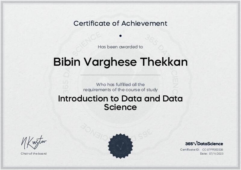 This user has been awarded the Introduction to Data and Data Science Certificate for successfully completing the course exam. Holding this certificate demonstrates their proficiency on the topic and signifies they are qualified to apply their newly acquired expertise in the fields of data analytics and data science.