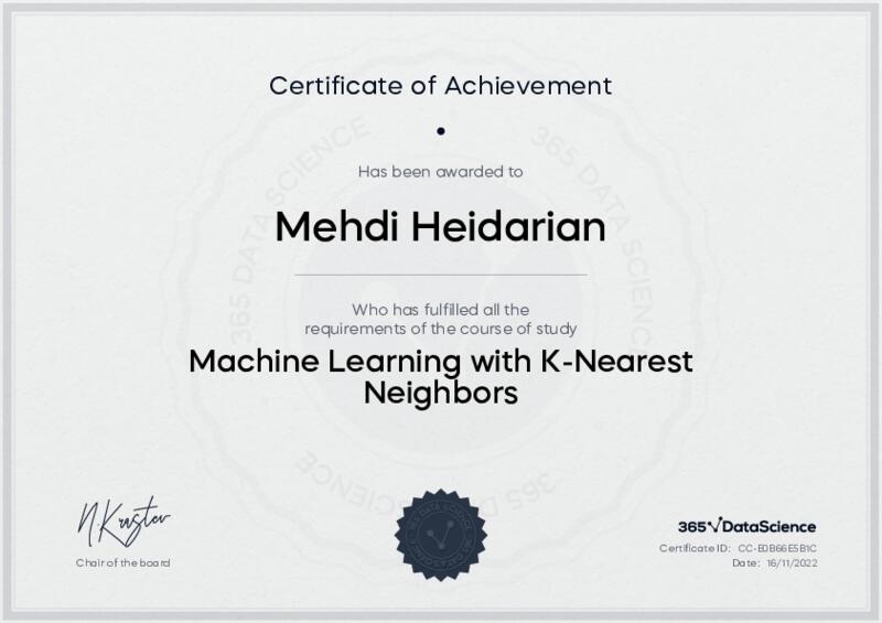 This user has been awarded the Machine Learning with K-Nearest Neighbors Certificate for successfully completing the course exam. Holding this certificate demonstrates their proficiency on the topic and signifies they are qualified to apply their newly acquired expertise in the fields of data analytics and data science.