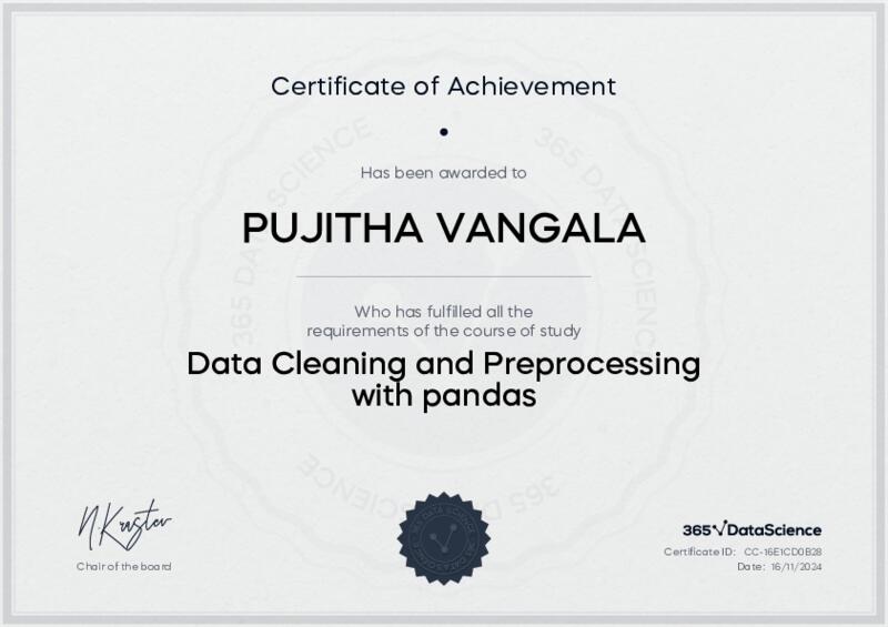 This user has been awarded the Data Cleaning and Preprocessing with pandas Certificate for successfully completing the course exam. Holding this certificate demonstrates their proficiency on the topic and signifies they are qualified to apply their newly acquired expertise in the fields of data analytics and data science.