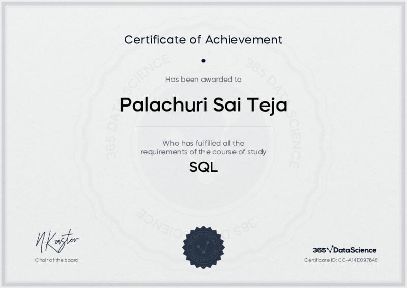This user has been awarded the SQL Certificate for successfully completing the course exam. Holding this certificate demonstrates their proficiency on the topic and signifies they are qualified to apply their newly acquired expertise in the fields of data analytics and data science.