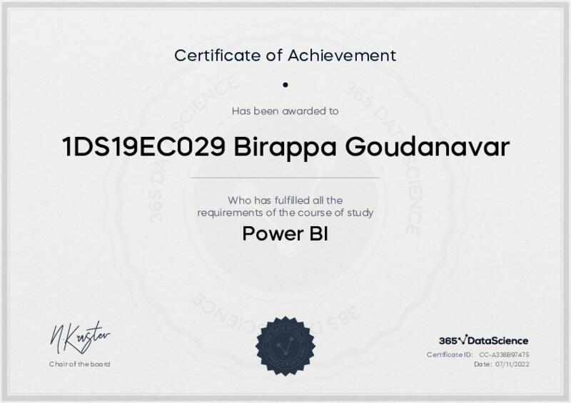 This user has been awarded the Power BI Certificate for successfully completing the course exam. Holding this certificate demonstrates their proficiency on the topic and signifies they are qualified to apply their newly acquired expertise in the fields of data analytics and data science.