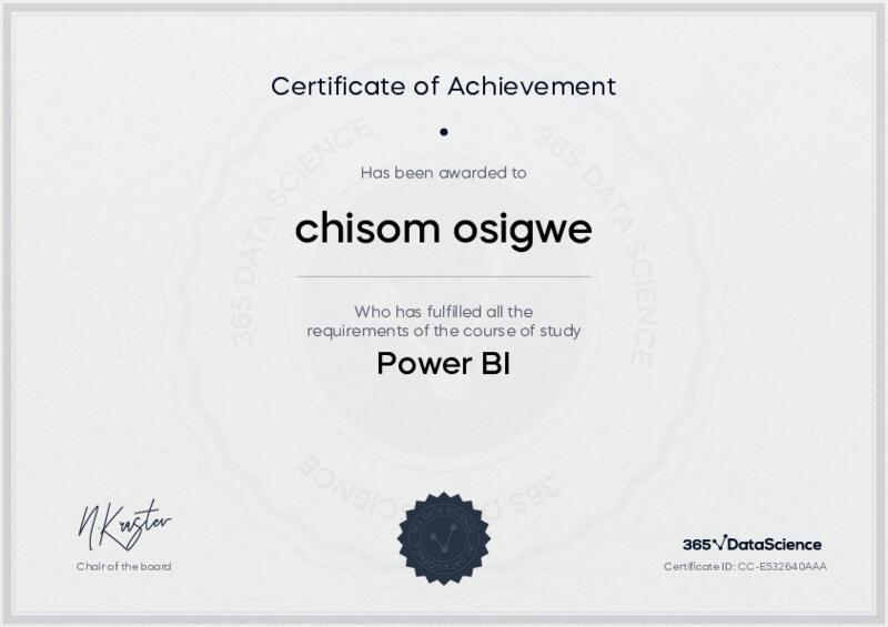 This user has been awarded the Power BI Certificate for successfully completing the course exam. Holding this certificate demonstrates their proficiency on the topic and signifies they are qualified to apply their newly acquired expertise in the fields of data analytics and data science.