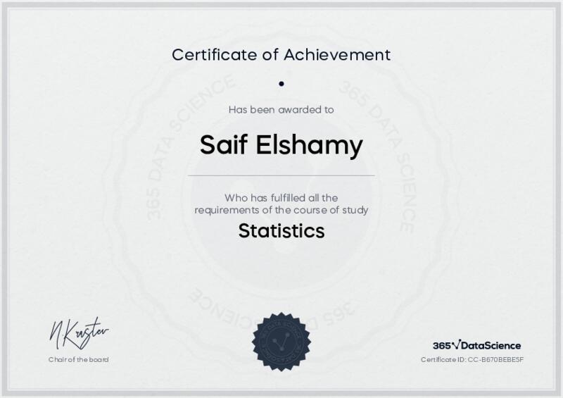 This user has been awarded the Statistics Certificate for successfully completing the course exam. Holding this certificate demonstrates their proficiency on the topic and signifies they are qualified to apply their newly acquired expertise in the fields of data analytics and data science.