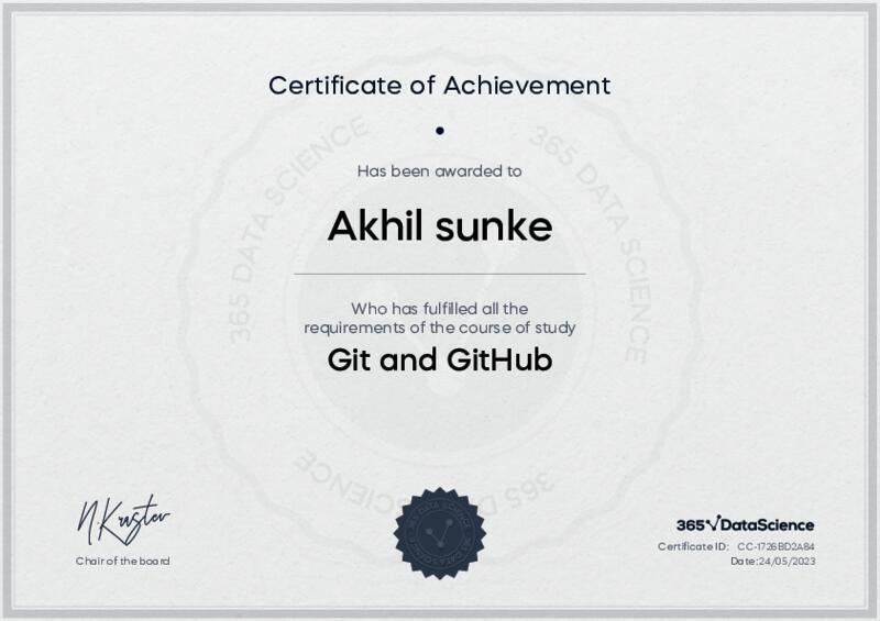 This user has been awarded the Git and GitHub Certificate for successfully completing the course exam. Holding this certificate demonstrates their proficiency on the topic and signifies they are qualified to apply their newly acquired expertise in the fields of data analytics and data science.