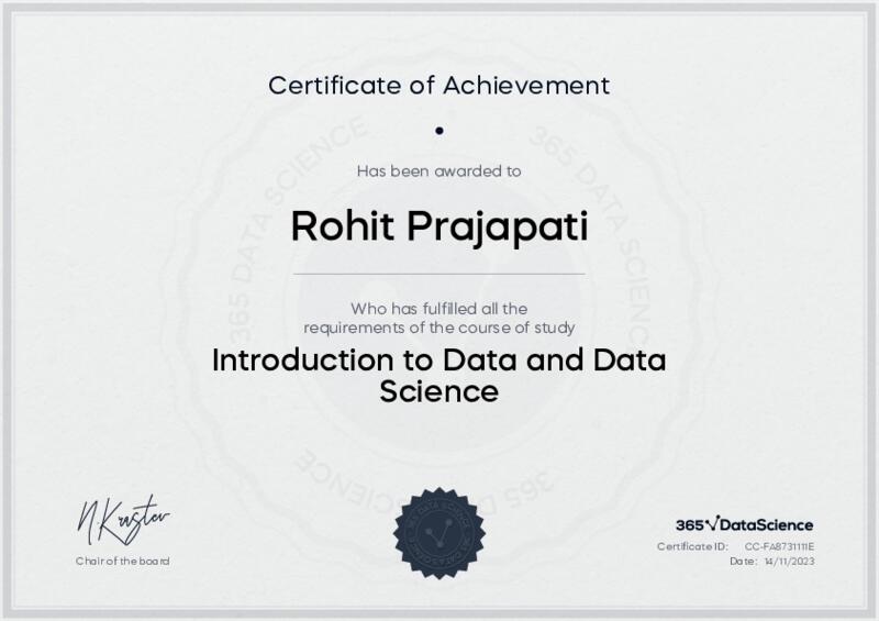 This user has been awarded the Introduction to Data and Data Science Certificate for successfully completing the course exam. Holding this certificate demonstrates their proficiency on the topic and signifies they are qualified to apply their newly acquired expertise in the fields of data analytics and data science.