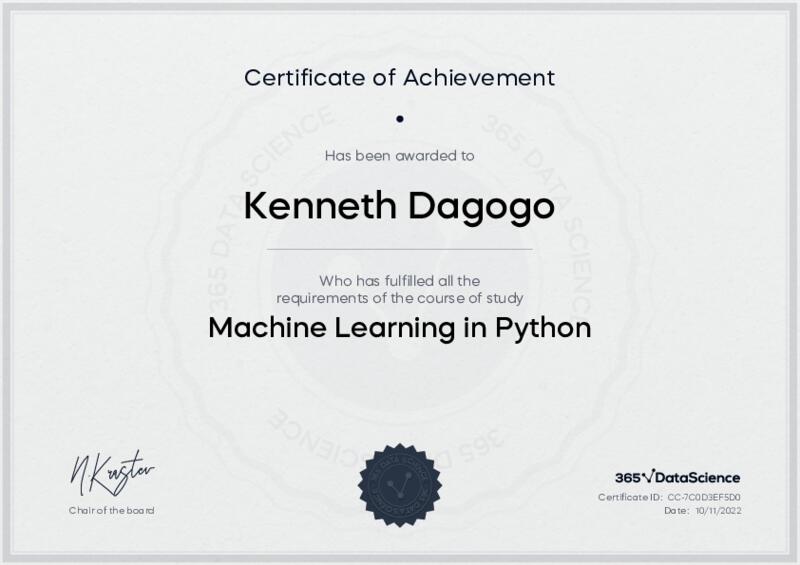 This user has been awarded the Machine Learning in Python Certificate for successfully completing the course exam. Holding this certificate demonstrates their proficiency on the topic and signifies they are qualified to apply their newly acquired expertise in the fields of data analytics and data science.