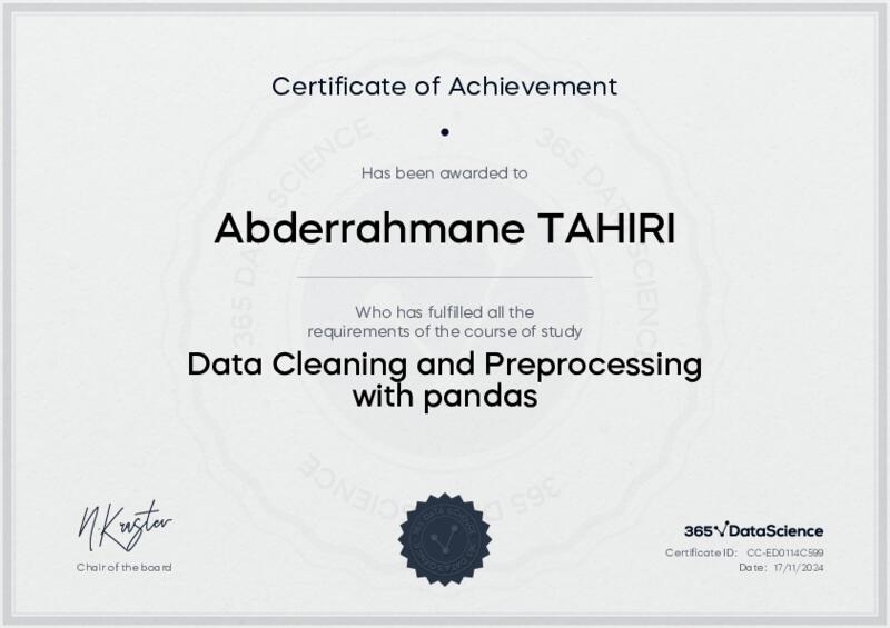 This user has been awarded the Data Cleaning and Preprocessing with pandas Certificate for successfully completing the course exam. Holding this certificate demonstrates their proficiency on the topic and signifies they are qualified to apply their newly acquired expertise in the fields of data analytics and data science.