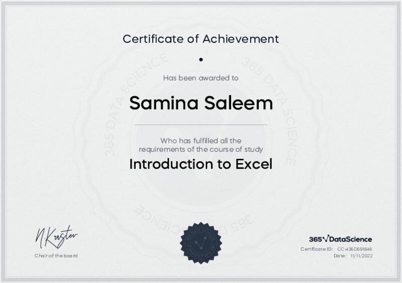 This user has been awarded the Introduction to Excel Certificate for successfully completing the course exam. Holding this certificate demonstrates their proficiency on the topic and signifies they are qualified to apply their newly acquired expertise in the fields of data analytics and data science.