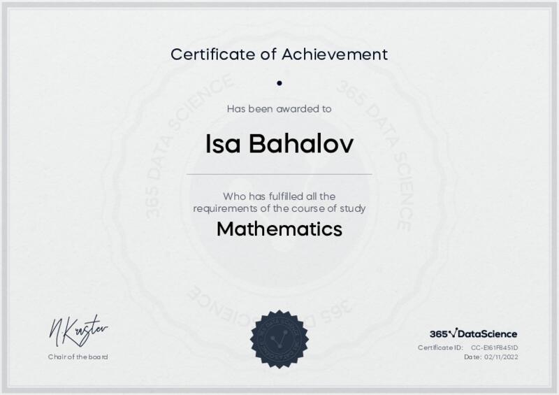 This user has been awarded the Mathematics Certificate for successfully completing the course exam. Holding this certificate demonstrates their proficiency on the topic and signifies they are qualified to apply their newly acquired expertise in the fields of data analytics and data science.