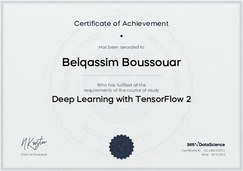 This user has been awarded the Deep Learning with TensorFlow 2 Certificate for successfully completing the course exam. Holding this certificate demonstrates their proficiency on the topic and signifies they are qualified to apply their newly acquired expertise in the fields of data analytics and data science.