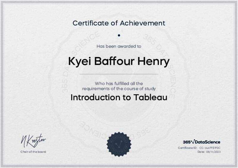 This user has been awarded the Introduction to Tableau Certificate for successfully completing the course exam. Holding this certificate demonstrates their proficiency on the topic and signifies they are qualified to apply their newly acquired expertise in the fields of data analytics and data science.