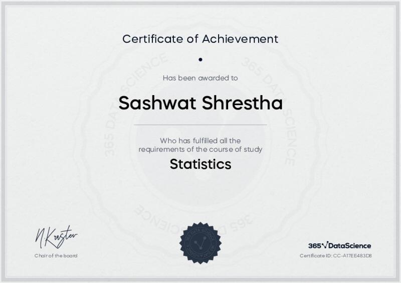 This user has been awarded the Statistics Certificate for successfully completing the course exam. Holding this certificate demonstrates their proficiency on the topic and signifies they are qualified to apply their newly acquired expertise in the fields of data analytics and data science.