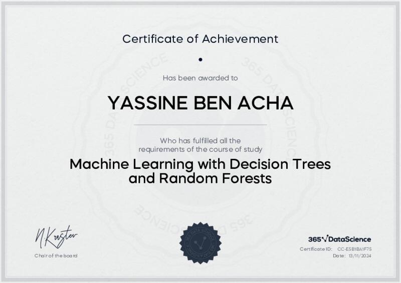 This user has been awarded the Machine Learning with Decision Trees and Random Forests Certificate for successfully completing the course exam. Holding this certificate demonstrates their proficiency on the topic and signifies they are qualified to apply their newly acquired expertise in the fields of data analytics and data science.