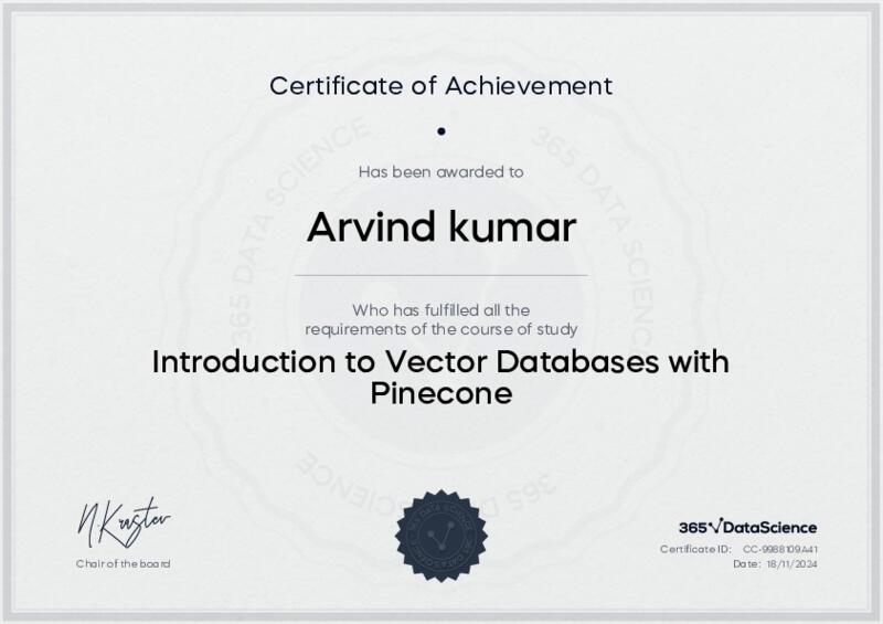 This user has been awarded the Introduction to Vector Databases with Pinecone Certificate for successfully completing the course exam. Holding this certificate demonstrates their proficiency on the topic and signifies they are qualified to apply their newly acquired expertise in the fields of data analytics and data science.