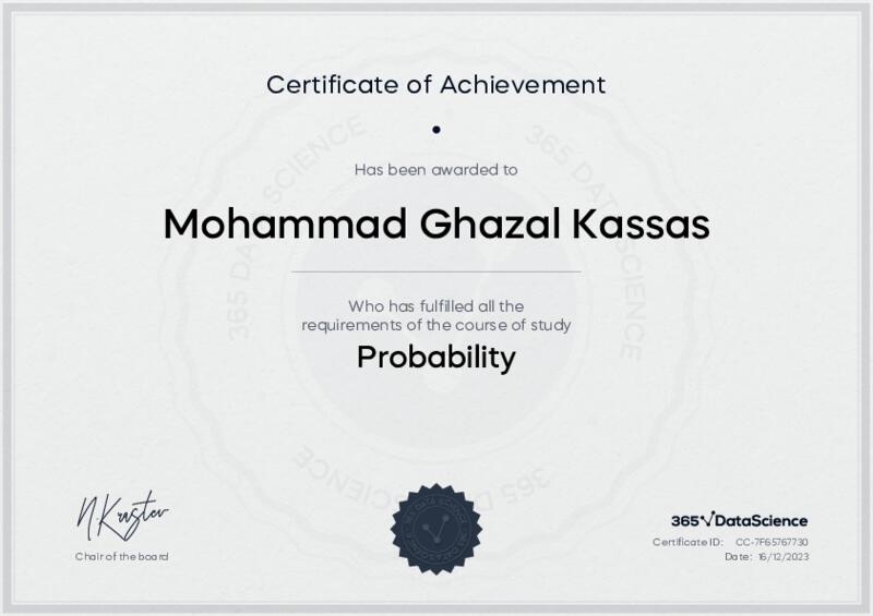 This user has been awarded the Probability Certificate for successfully completing the course exam. Holding this certificate demonstrates their proficiency on the topic and signifies they are qualified to apply their newly acquired expertise in the fields of data analytics and data science.
