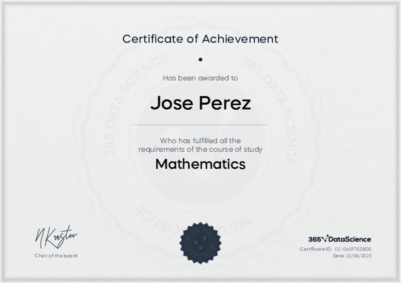 This user has been awarded the Mathematics Certificate for successfully completing the course exam. Holding this certificate demonstrates their proficiency on the topic and signifies they are qualified to apply their newly acquired expertise in the fields of data analytics and data science.