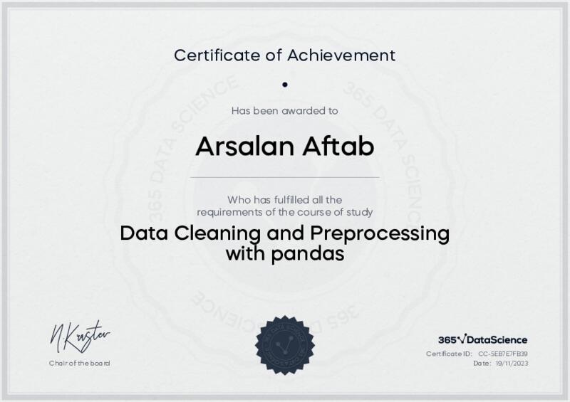 This user has been awarded the Data Cleaning and Preprocessing with pandas Certificate for successfully completing the course exam. Holding this certificate demonstrates their proficiency on the topic and signifies they are qualified to apply their newly acquired expertise in the fields of data analytics and data science.