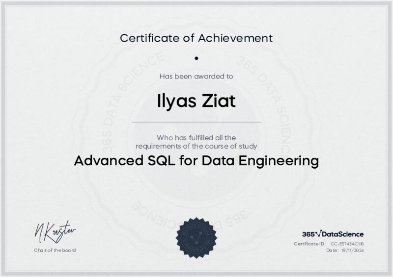 This user has been awarded the Advanced SQL for Data Engineering Certificate for successfully completing the course exam. Holding this certificate demonstrates their proficiency on the topic and signifies they are qualified to apply their newly acquired expertise in the fields of data analytics and data science.