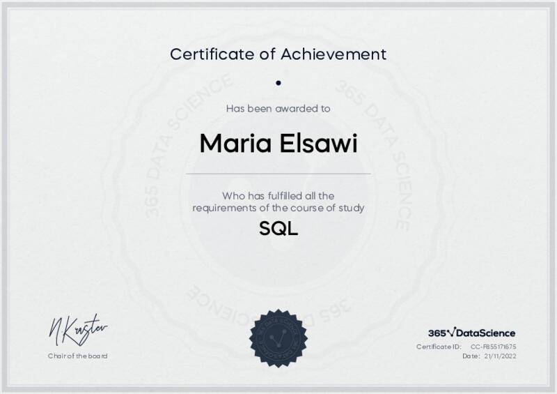 This user has been awarded the SQL Certificate for successfully completing the course exam. Holding this certificate demonstrates their proficiency on the topic and signifies they are qualified to apply their newly acquired expertise in the fields of data analytics and data science.