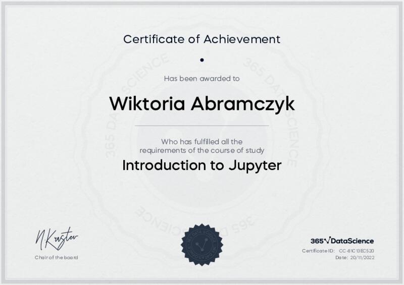 This user has been awarded the Introduction to Jupyter Certificate for successfully completing the course exam. Holding this certificate demonstrates their proficiency on the topic and signifies they are qualified to apply their newly acquired expertise in the fields of data analytics and data science.