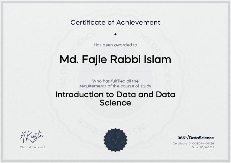 This user has been awarded the Introduction to Data and Data Science Certificate for successfully completing the course exam. Holding this certificate demonstrates their proficiency on the topic and signifies they are qualified to apply their newly acquired expertise in the fields of data analytics and data science.